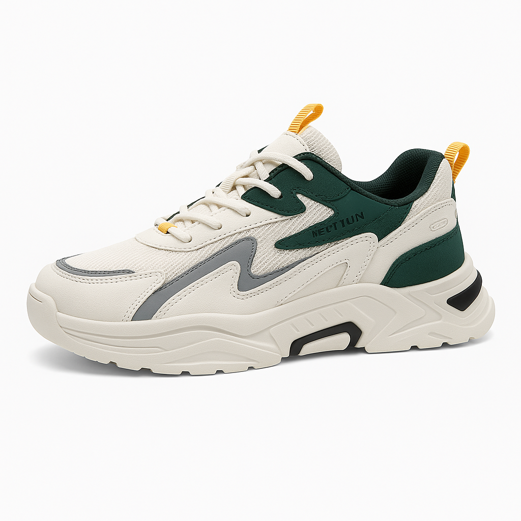 Construído com couro ecológico de alta qualidade e detalhes em lona, oferece durabilidade, respirabilidade e um visual moderno. O cabedal apresenta perfurações estratégicas para manter os pés frescos ao longo do dia.